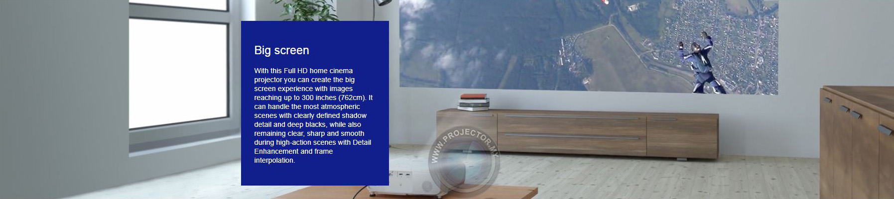 With this Full HD home cinema projector you can create the big screen experience with images reaching up to 300 inches (762cm). It can handle the most atmospheric scenes with clearly defined shadow detail and deep blacks, while also remaining clear,